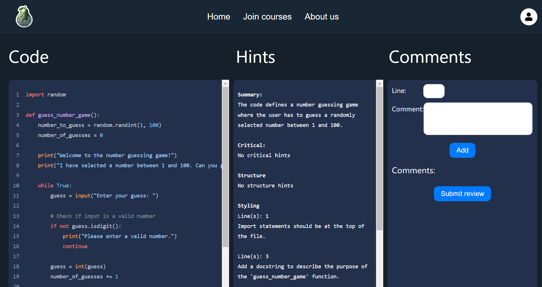What sets our product apart is our commitment to enhancing the quality of peer reviews. Before a reviewer receives an assignment, it is processed through a Large Language Model (LLM). This advanced AI technology thoroughly examines the submitted code, identifying areas for potential improvement. It then provides the reviewer with insightful hints and guidance on what to look for during their review. This not only helps reviewers provide more constructive feedback but also aids in their own learning and understanding of the subject matter.
