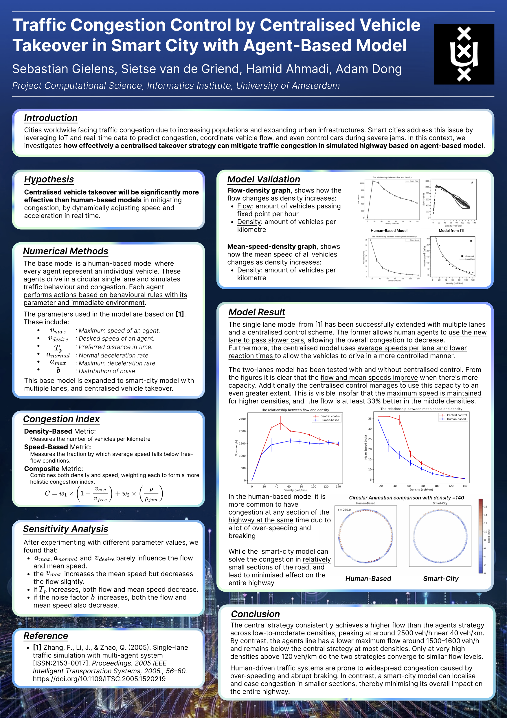 This project tried to investigate how effectively a centralised takeover strategy can mitigate traffic congestion in simulated highway based on agent-based model. This was done through the reproduction of an already existent agent-based model based on a paper by 1. The model was expanded upon by adding agent behaviour for multiple lanes and logic that simulates a central controller. It was hypothesized that centralized vehicle takeover will be significantly more effective than human-based models in mitigating congestion. This was confirmed as the central vehicle takeover managed to increase the average speed of the vehicles and maintain a higher flow under congested conditions.